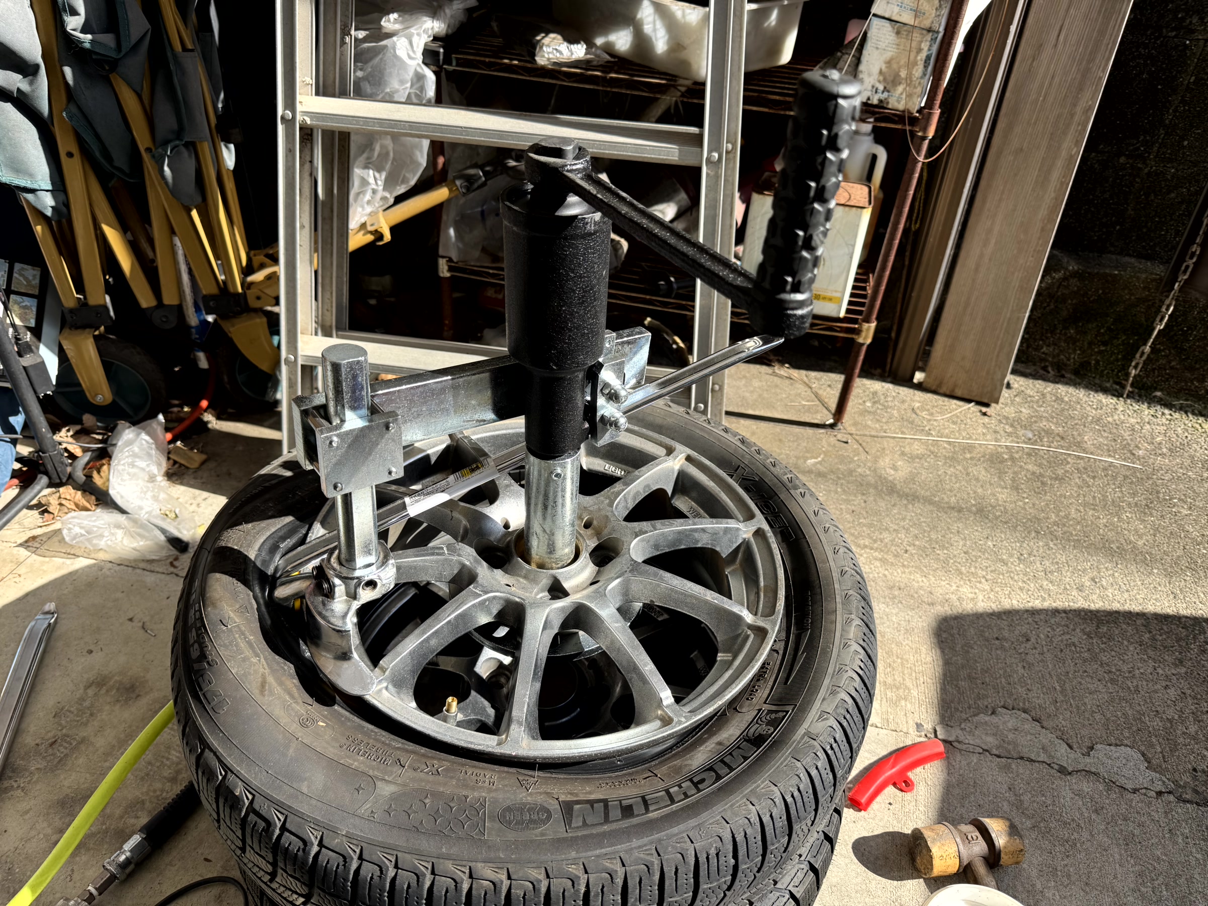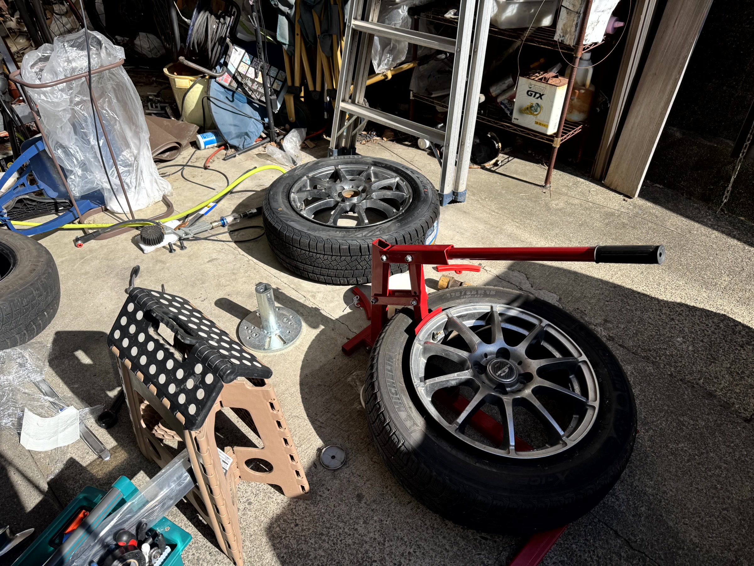タイヤ屋で組み換えの予約を取ろうとしたら1ヶ月先まで空きがないと言われたので手動チャンジャー買って交換しました。